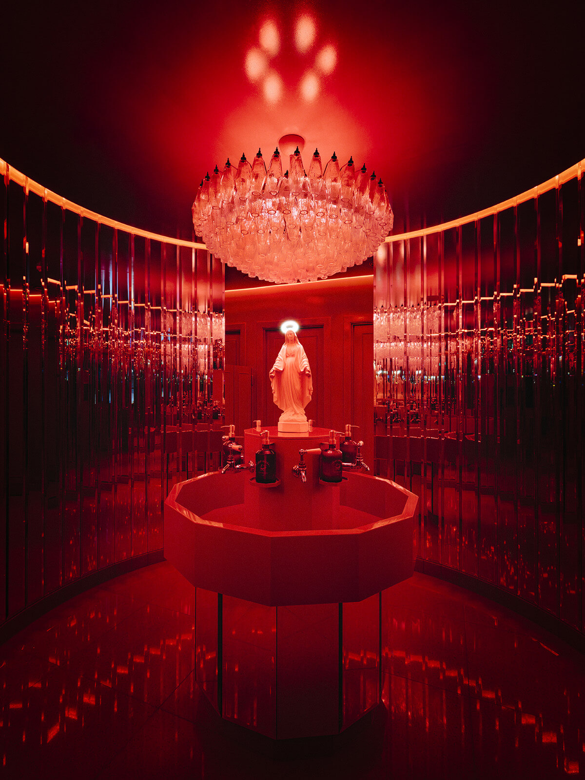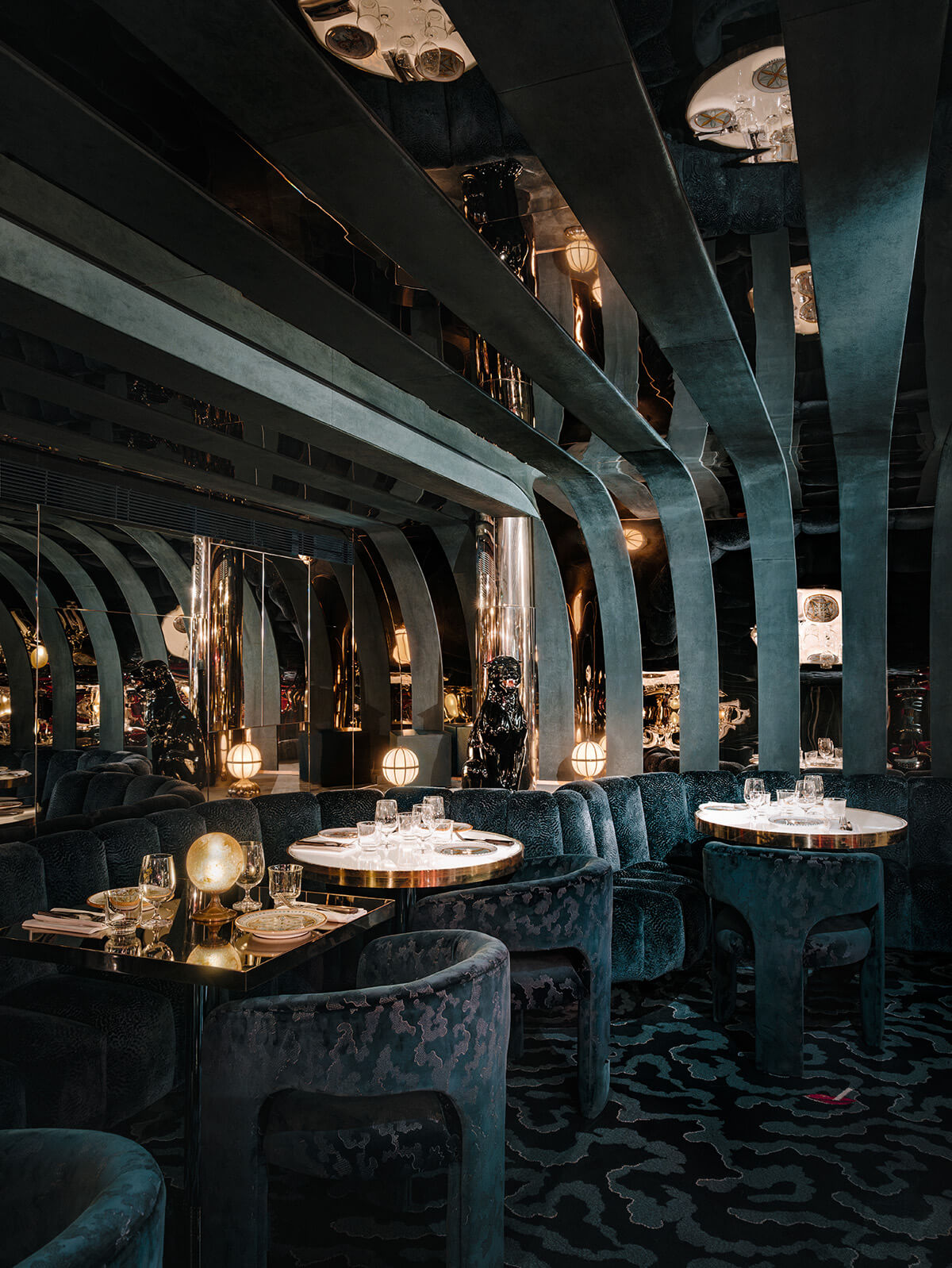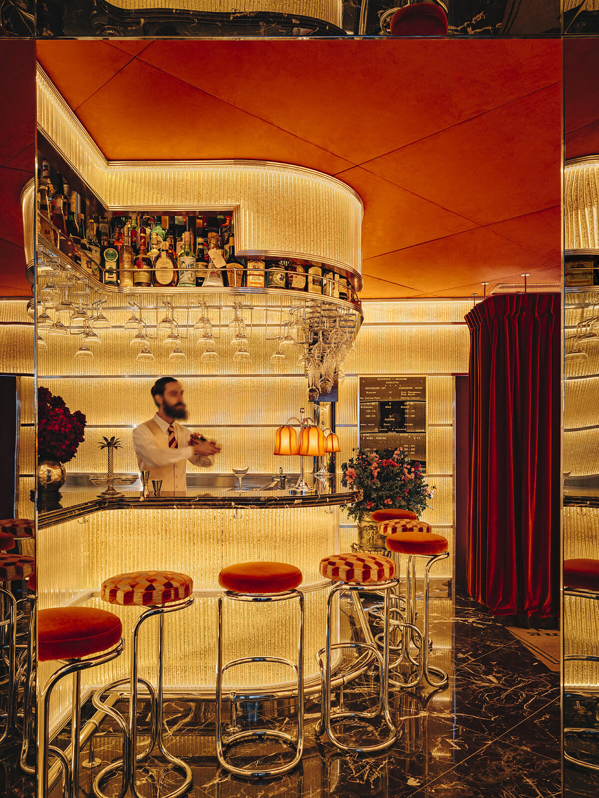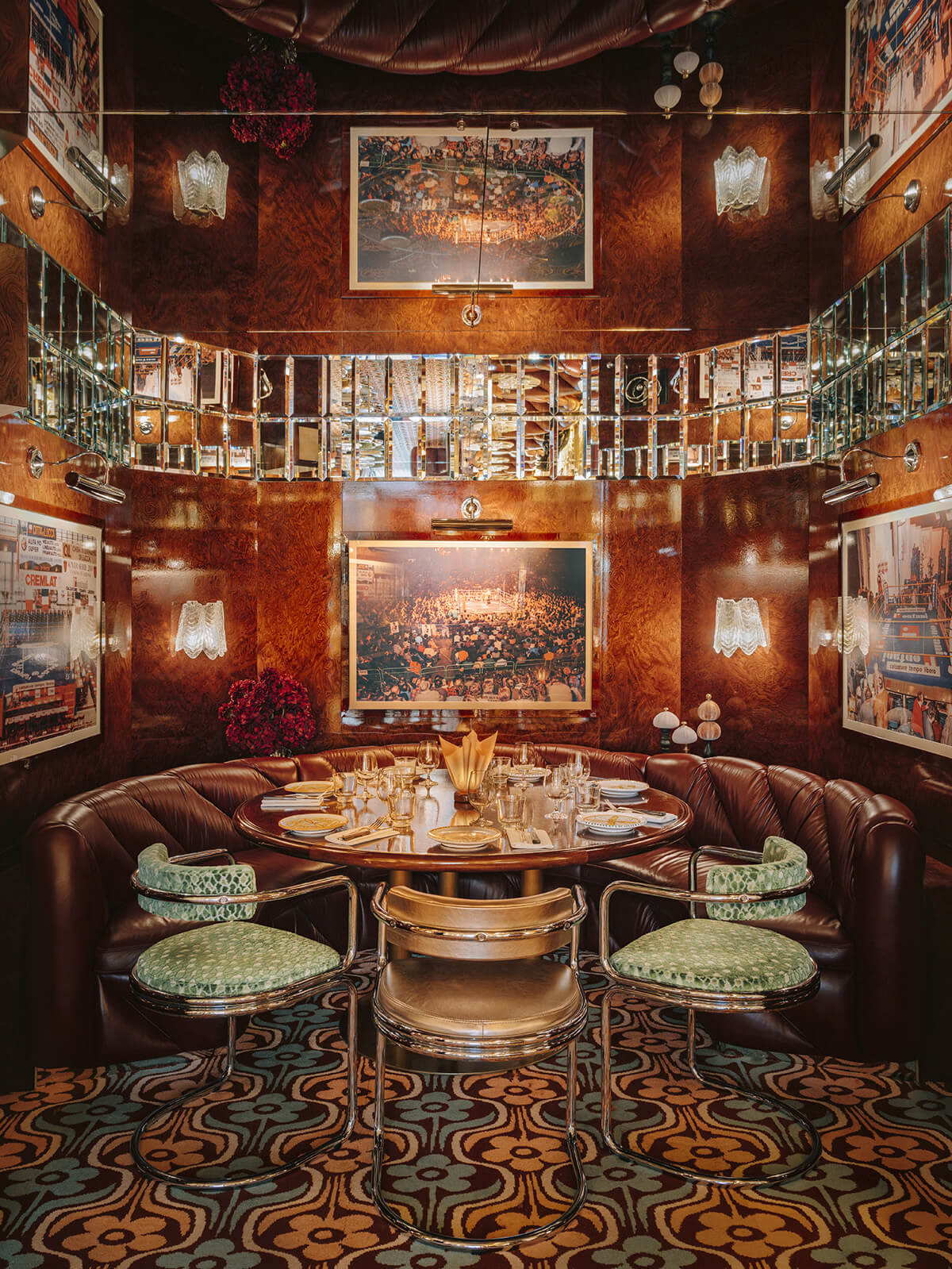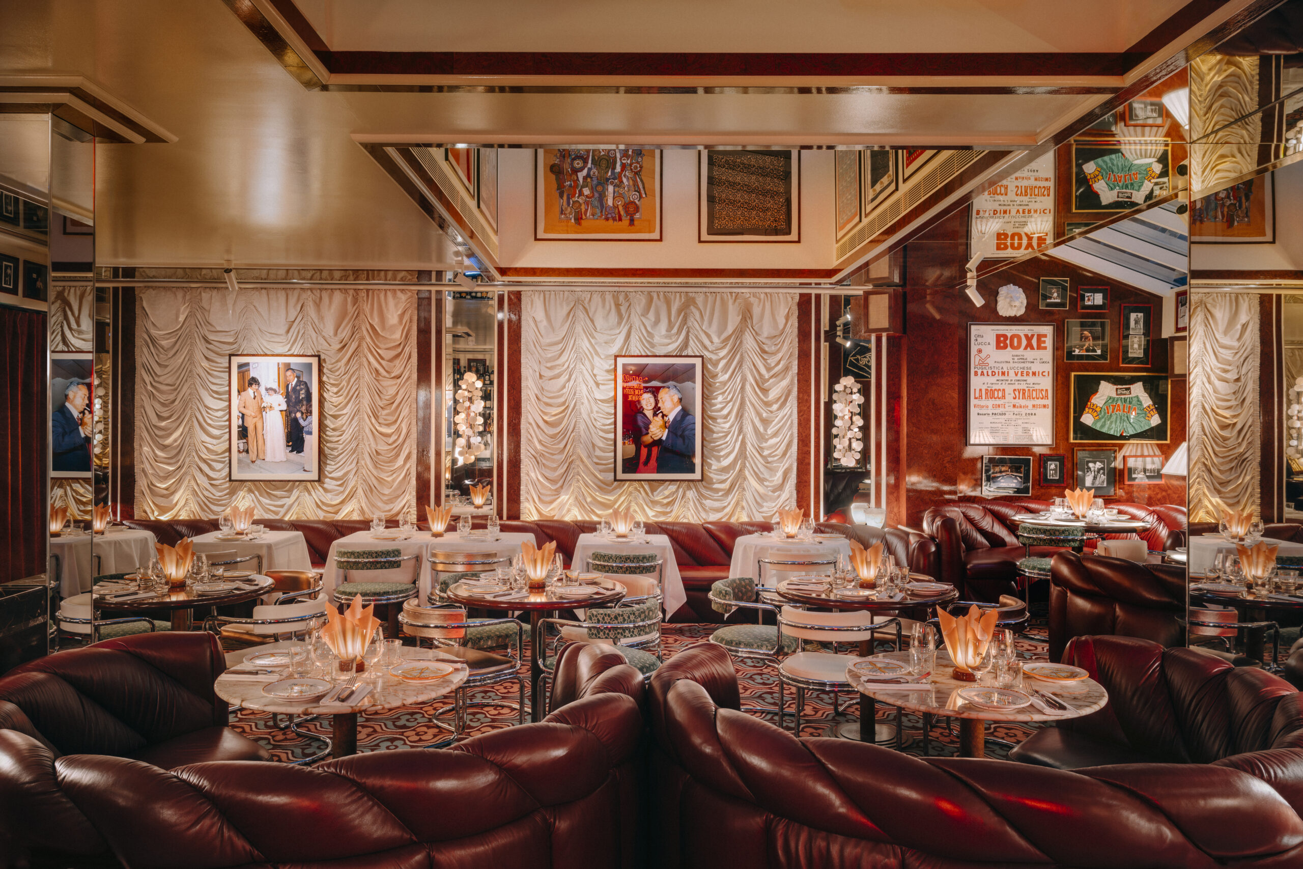 Designed by the restaurant’s in house design team Studio Kiki, the opulent interiors mimic the decadent but familial atmosphere of the late 1980s Italo-American trattoria.